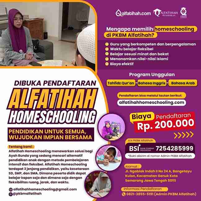 Hey, kamu lagi cari cara belajar yang seru, fleksibel, tapi tetap canggih? Selamat datang di Alfatihah Homeschooling! Di sini, kamu nggak cuma belajar dari rumah. Di sini, kita bikin belajar jadi lebih asyik, santai, tapi tetap berkualitas. Alfatihah Homeschooling itu solusi keren buat kamu yang pengen pendidikan terbaik tanpa harus terjebak di rutinitas sekolah biasa. Alfatihah Homeschooling adalah cara belajar dari rumah atau di mana aja dengan program yang disesuaikan sama kebutuhan dan gaya belajar kamu. Tanpa bel jam sekolah yang bikin panik, tanpa drama, cuma belajar yang bikin nyaman dan seru.